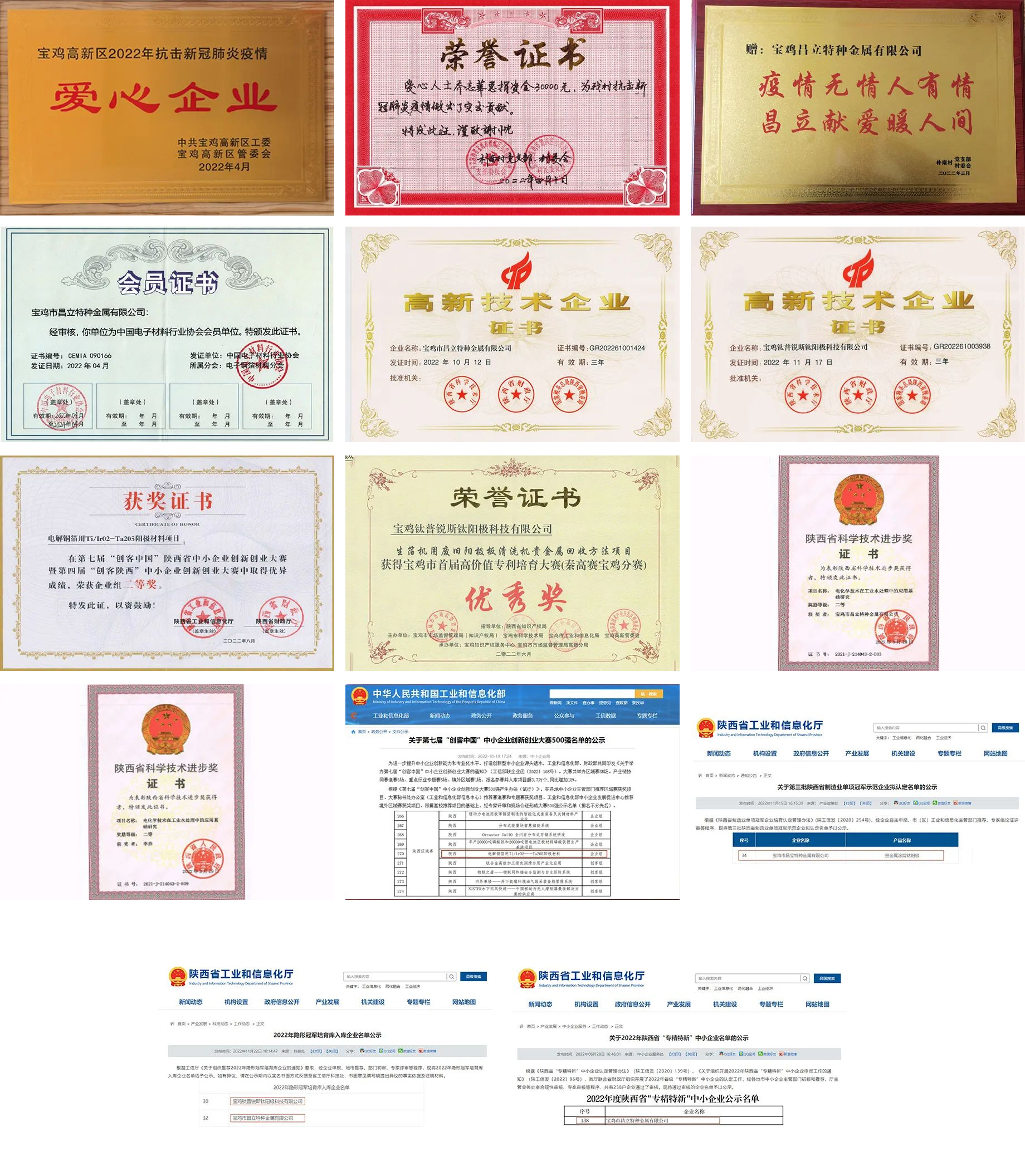 歲月不居,天道酬勤。回顧2022年,公司創(chuàng)造了可喜可賀的成績。在疫情期間承擔(dān)社會責(zé)任,助力一線抗疫。昌立公司被認(rèn)定為陜西省“專精特新”中小企業(yè);《電化學(xué)技術(shù)在工業(yè)水處理中的應(yīng)用基礎(chǔ)研究》項目獲“省科學(xué)技術(shù)進步獎”二等獎;入選第三批陜西省制造業(yè)單項冠軍示范企業(yè);入選2022年陜西隱形冠軍培育庫。鈦普銳斯被認(rèn)定為“國家高新技術(shù)企業(yè)”;2022年陜西省秦創(chuàng)原高價值專利大賽分賽區(qū)-“寶雞高價值專利培育大賽優(yōu)秀獎”;第四屆“創(chuàng)客陜西”中小企業(yè)創(chuàng)新創(chuàng)業(yè)大賽省級決賽獲大賽企業(yè)組二等獎;入圍第七屆“創(chuàng)客中國”中小企業(yè)創(chuàng)新創(chuàng)業(yè)大賽500強;入選2022年陜西隱形冠軍培育庫。